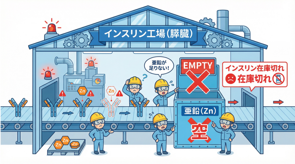 つまり、体内の亜鉛が不足していると、「質の良いインスリンが作れない(在庫切れ)」という状態に陥ってしまうのです。