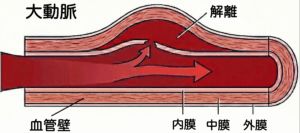 「大動脈解離」とは、内膜に亀裂が入り、そこから血液が流れ込んでしまい、血管の壁が裂けてしまう病気です。